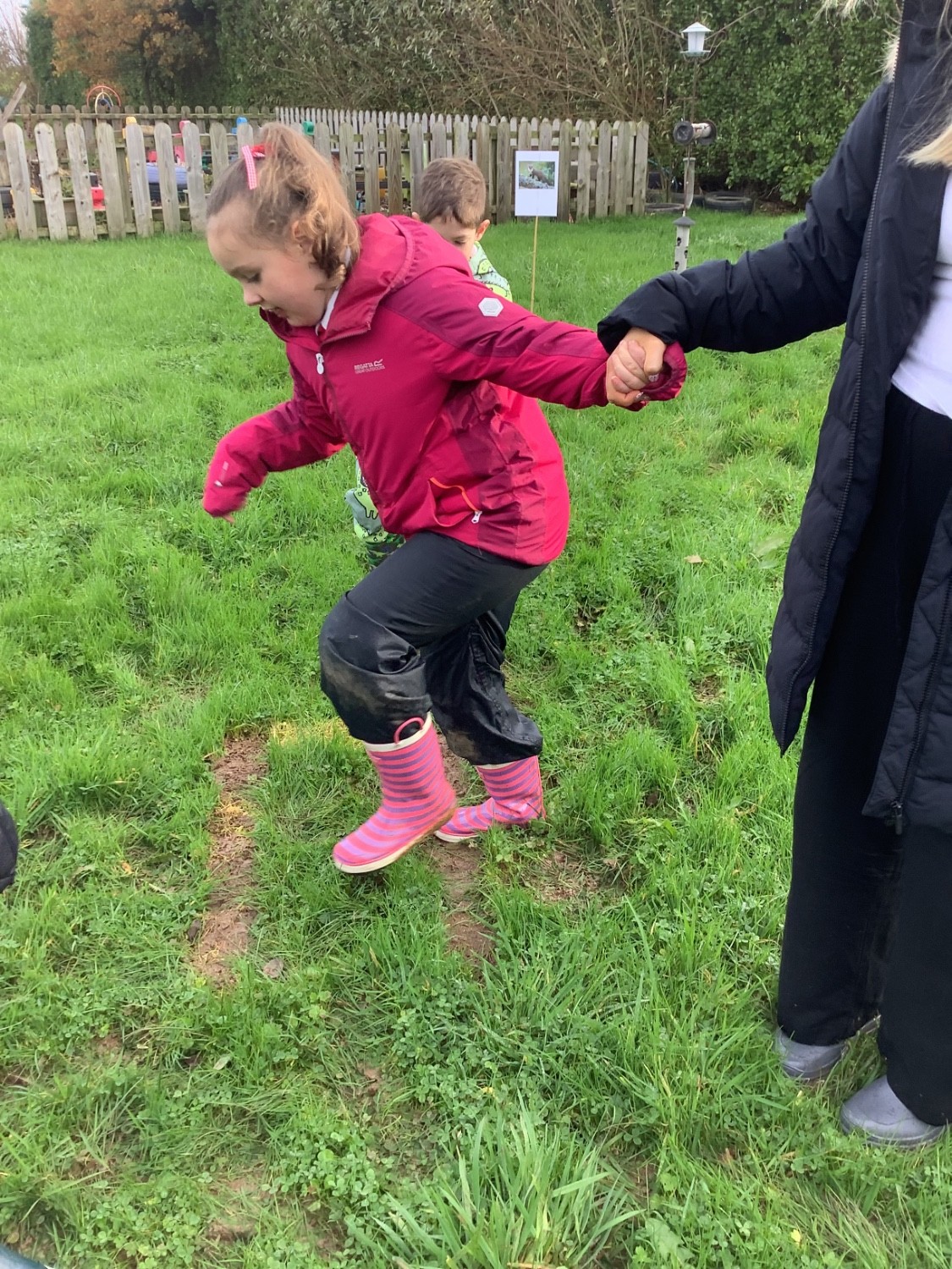 Today’s session was full of outdoor excitement and muddy adventures! After a week of wet weather, the children were greeted by plenty of gloopy mud! They thought of different adjectives to describe the mud, including ‘squelchy’, ‘oozy’ and ‘sticky’. One child declared himself ‘stuck’ in the mud, and the children delighted in forming a human chain to pull him out!